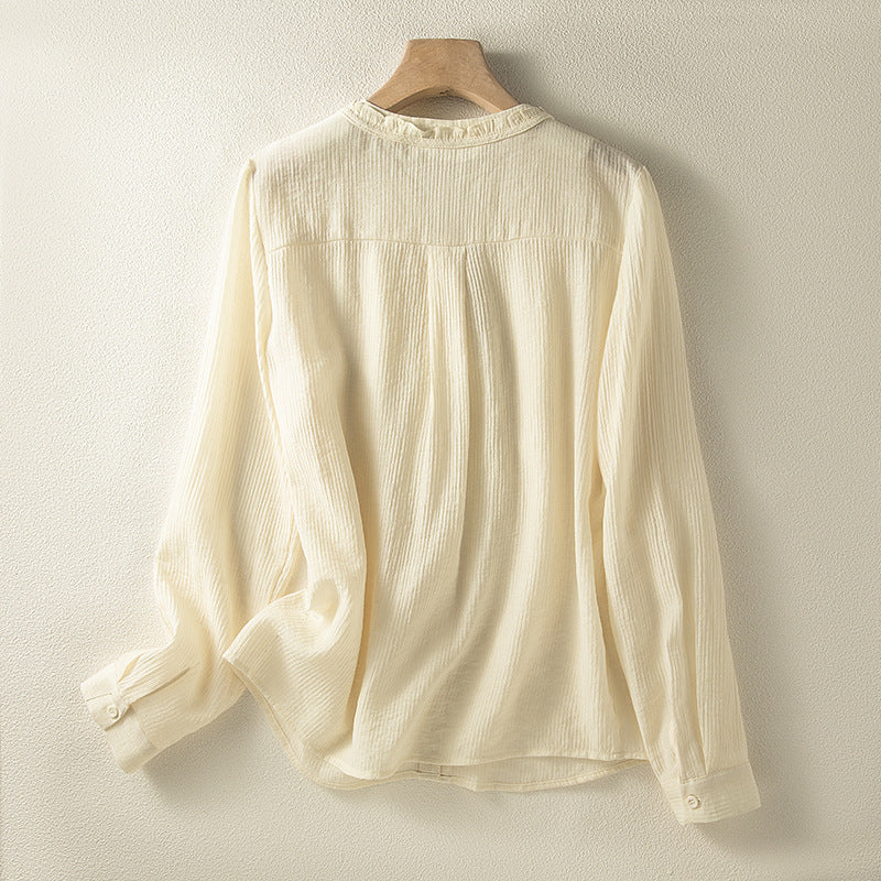 Woven from our featherlight Gossamer Linen, this blouse flows with gathered ease and gentle texture. A row of buttons leads the eye, while the subtle neckline ruffle adds a quiet flourish.