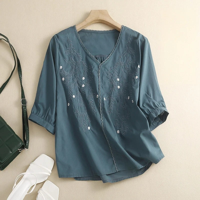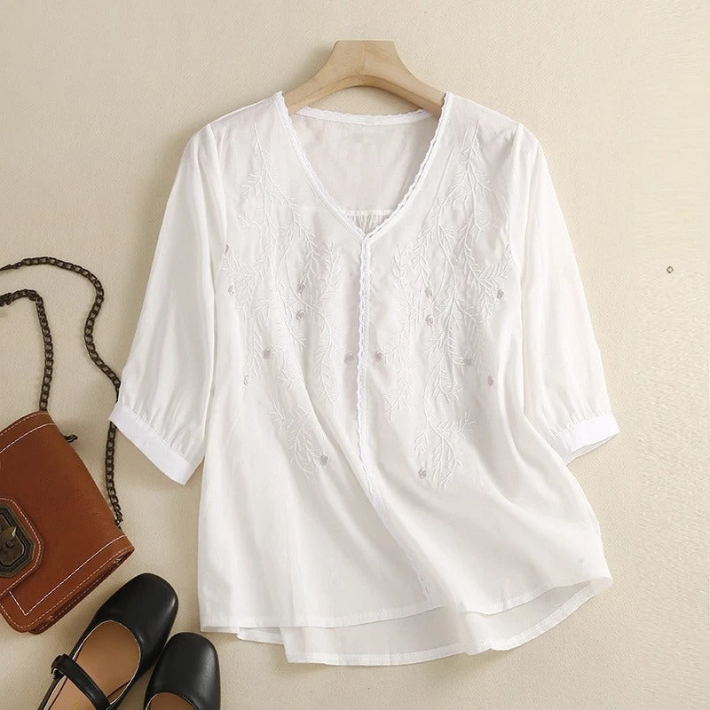 Spun from our featherlight Gossamer Linen, this blouse blooms with delicate embroidery and a soft V-neckline.