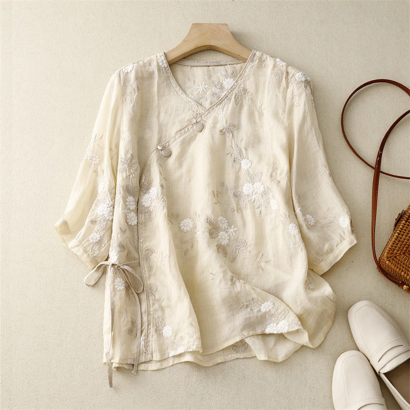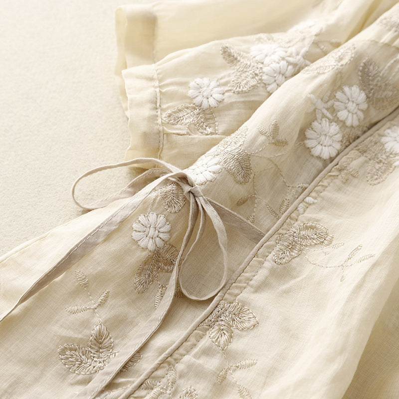 Woven from our featherlight Gossamer linen, this blouse drapes with floral embroidery and soft diagonal ties. Three delicate buttons trace the neckline, while gathered sleeves lend quiet rhythm—stitched for days touched by breeze and bloom.