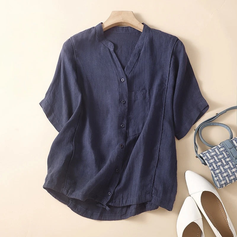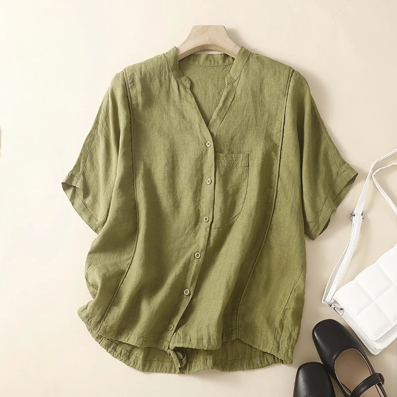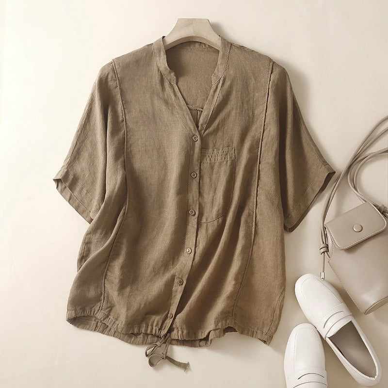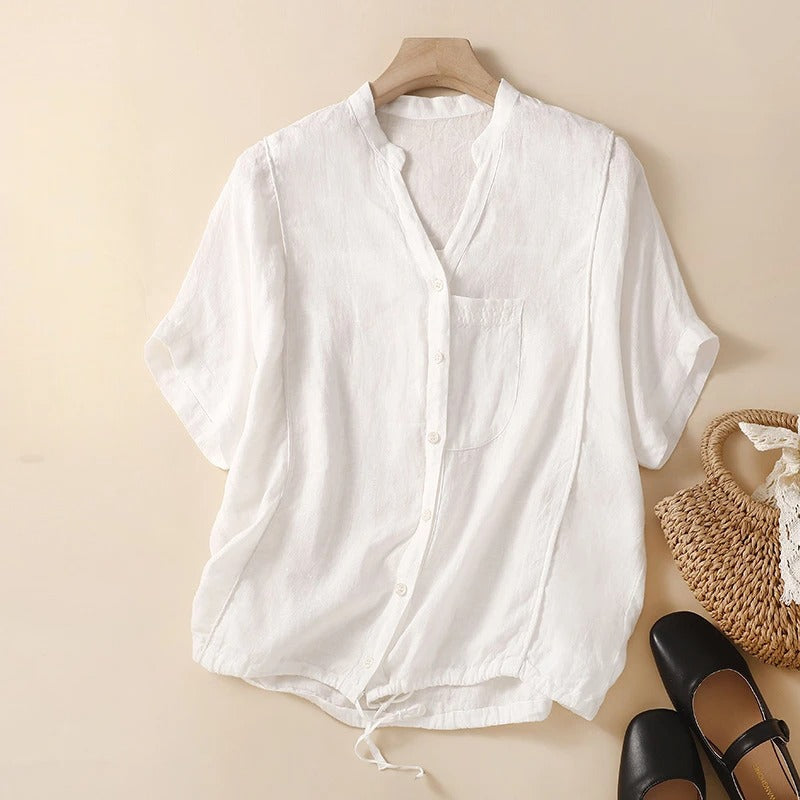 Made from breathable linen, this shirt drapes with quiet ease. A soft V-neckline meets a row of tonal buttons, while a drawstring hem allows gentle shaping—stitched for sunlit hours and slow, steady days.