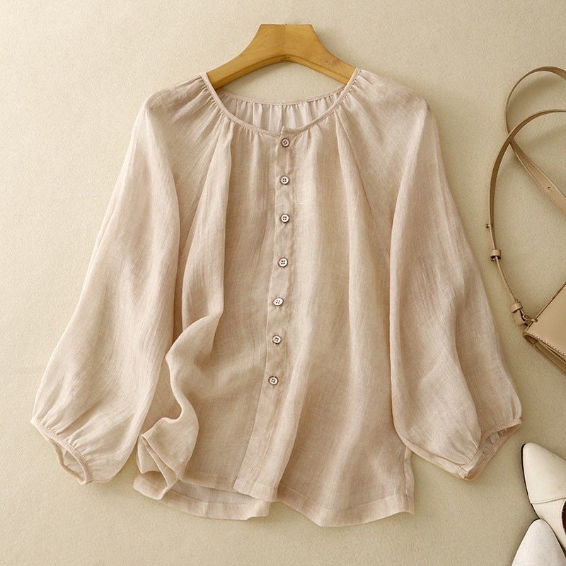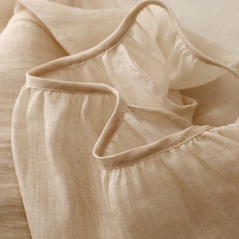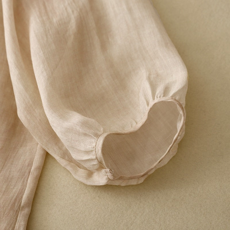 Rendered in Gossamer linen for its breathable texture and soft resilience, this blouse floats with voluminous sleeves and a gathered neckline. Lightly structured yet relaxed, it moves with grace—woven for quiet mornings and unhurried days.