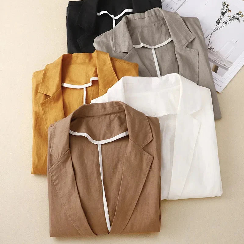 Crafted from our signature Gossamer Linen, this blazer captures the airiness of summer with tailored restraint. The easy drape and clean single-button closure offer a quiet elegance that moves effortlessly from weekday to weekend.