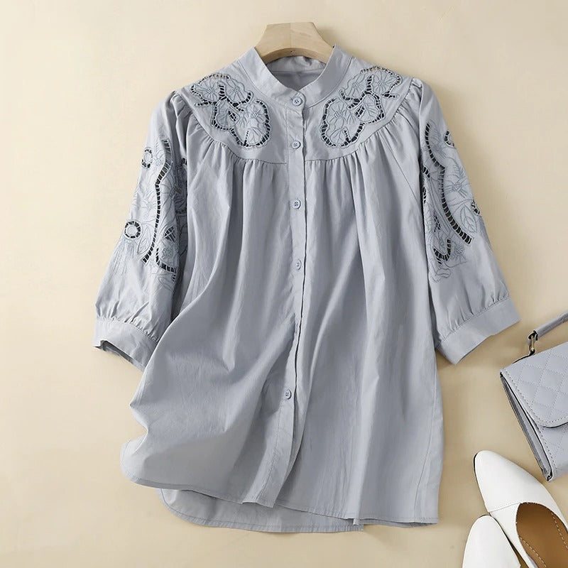 Spun from our airy Gossamer Linen, this blouse is all softness and sky. Intricate embroidery traces the shoulders like a whispered story, while the billowy shape floats through warm afternoons with grace.