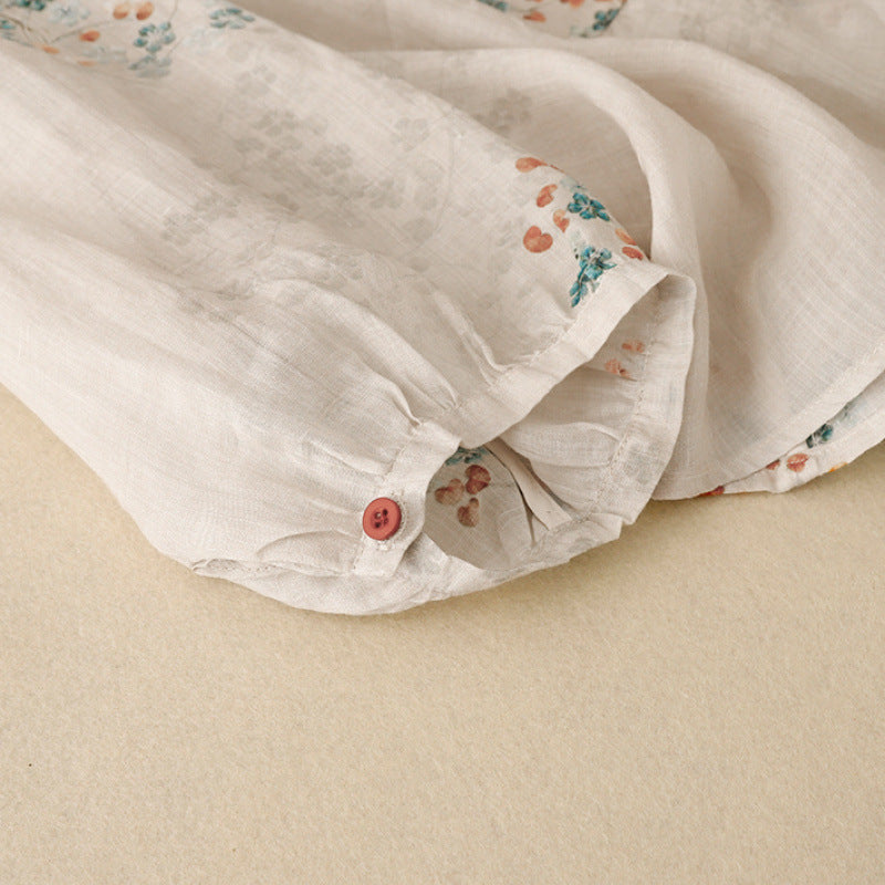 A storybook silhouette for slow, sun-washed mornings. Crafted from sheer gossamer linen, this blouse blooms with whisper-soft florals and gathers gently at the hem for a floaty, feminine shape. It wears like a breeze and moves like a thought—equal parts poetry and presence.