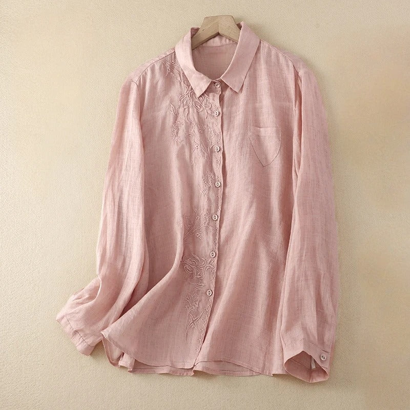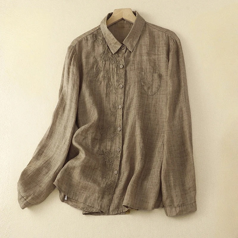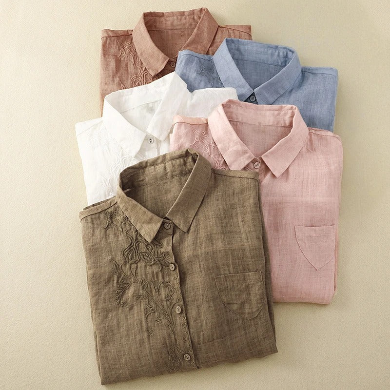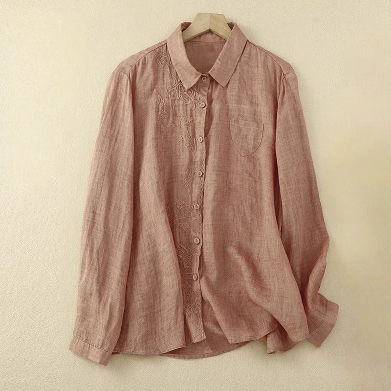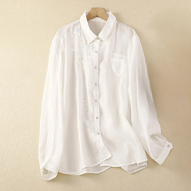 Woven from our weightless gossamer linen, this blouse carries hand-drawn florals in delicate tonal embroidery—an ode to botanical stillness. The relaxed silhouette drapes like morning mist, with a single chest pocket lending subtle contrast. A whisper of craft, designed for days that linger softly.