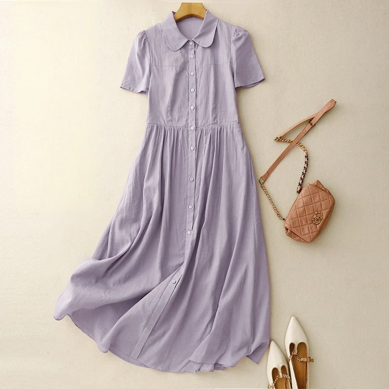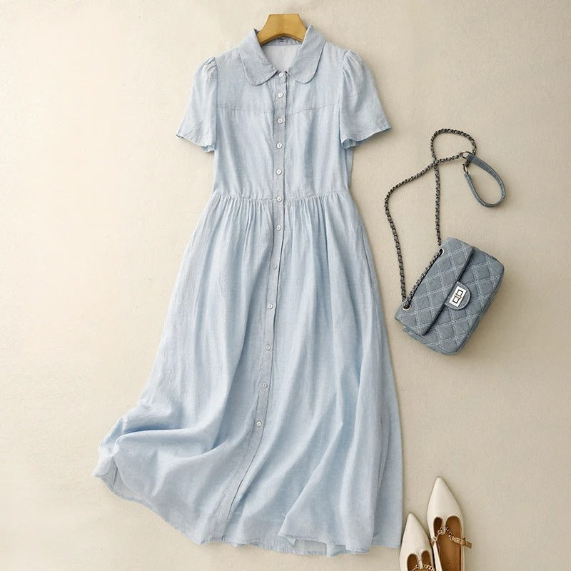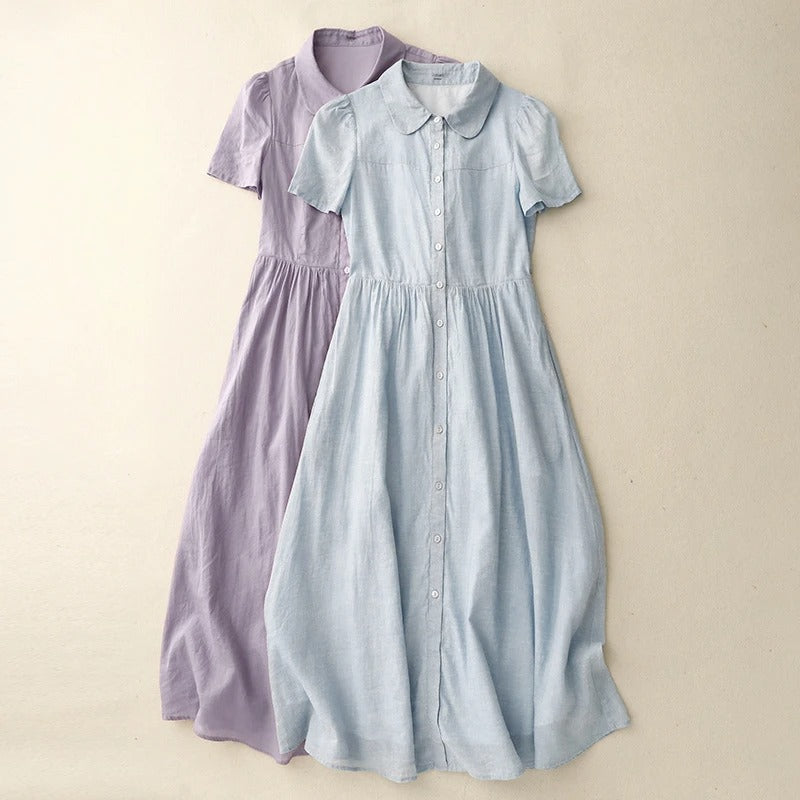 Crafted from our signature Gossamer linen, this button-front dress brings soft movement and a gentle waistline to quiet summer days. A rounded collar adds charm, while gathered seams invite ease into every step.