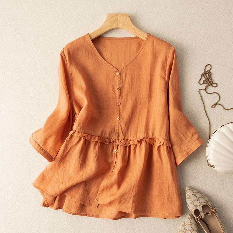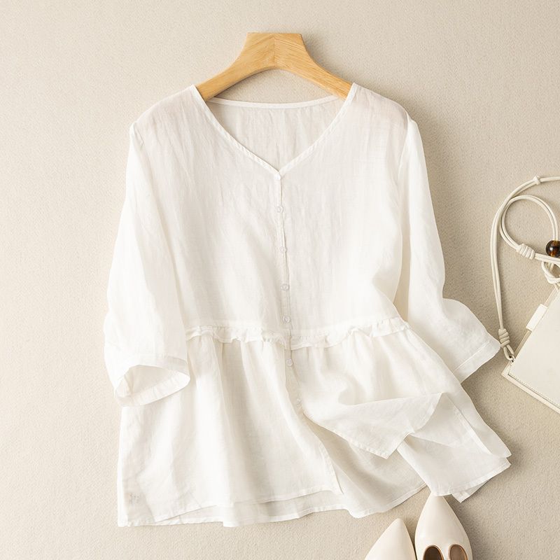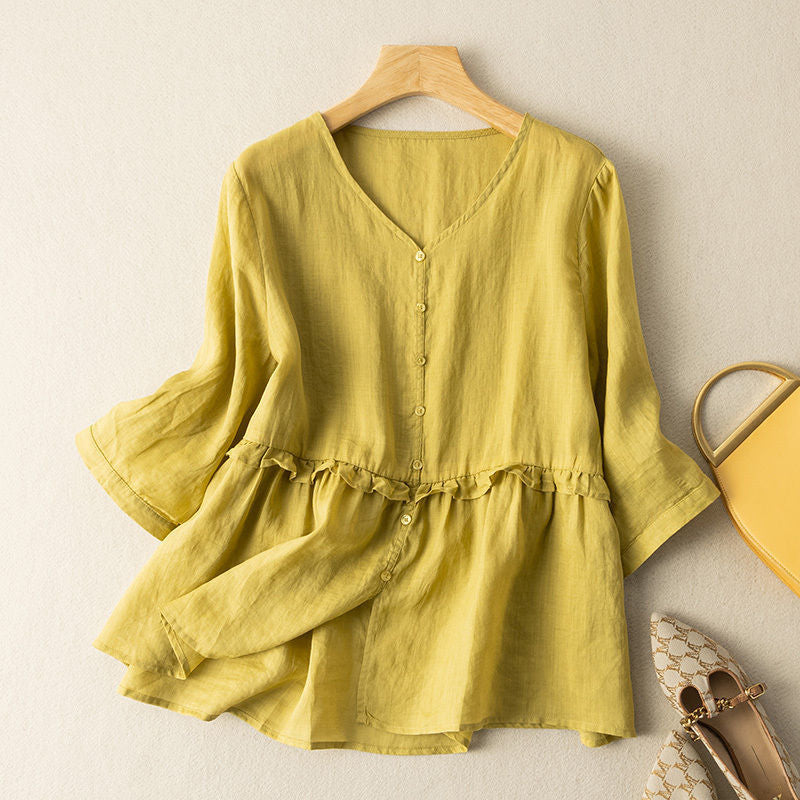 Crafted from pure linen, this blouse sways with a gathered waist and three-quarter sleeves. A row of delicate buttons and soft ruffles lend quiet rhythm—stitched for days that drift and pause.