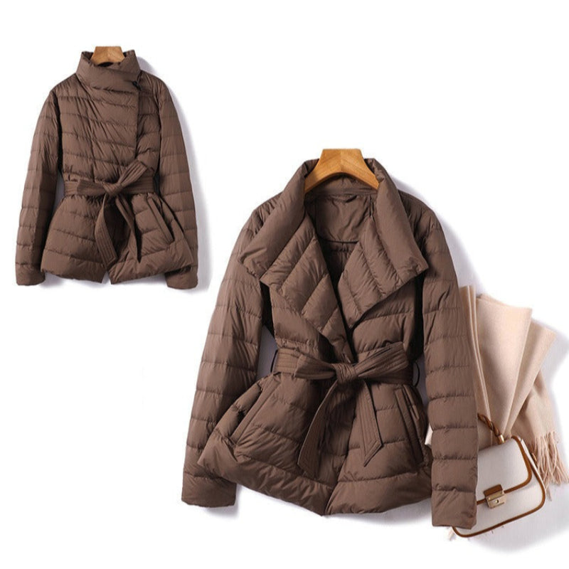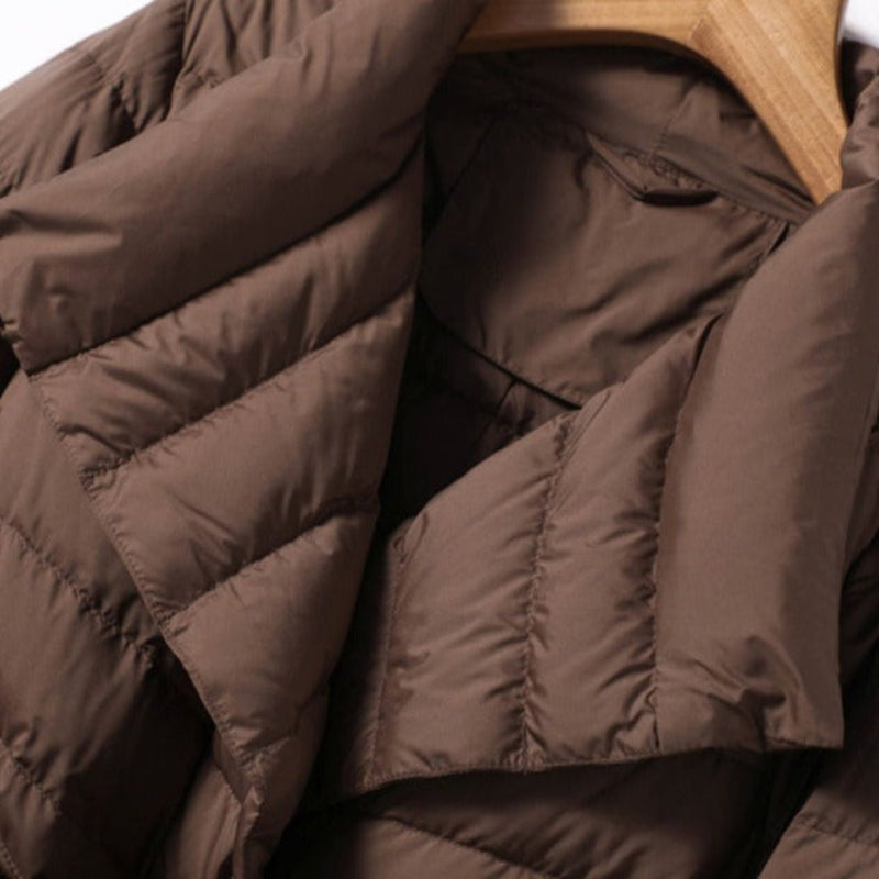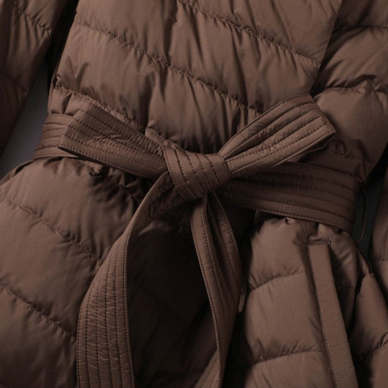 A bold interplay of heritage tailoring and contemporary statement. With voluminous lapels and a cinched waist, this down coat channels an unapologetic silhouette. Elevated in tone and tactility, its structural finesse and golden warmth speak fluent luxury.