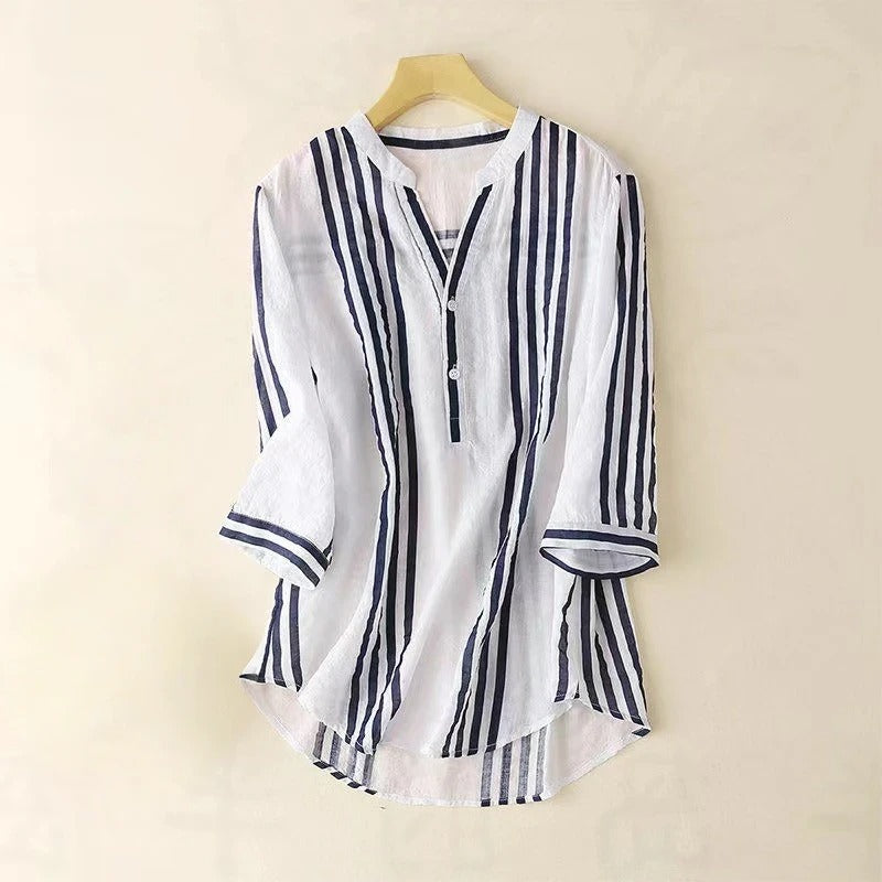 Rendered in gossamer linen, this shirt draws on nautical elegance with clean vertical stripes that elongate and flatter. The soft drape and subtle sheen invite effortless pairing with both tailored and relaxed silhouettes.