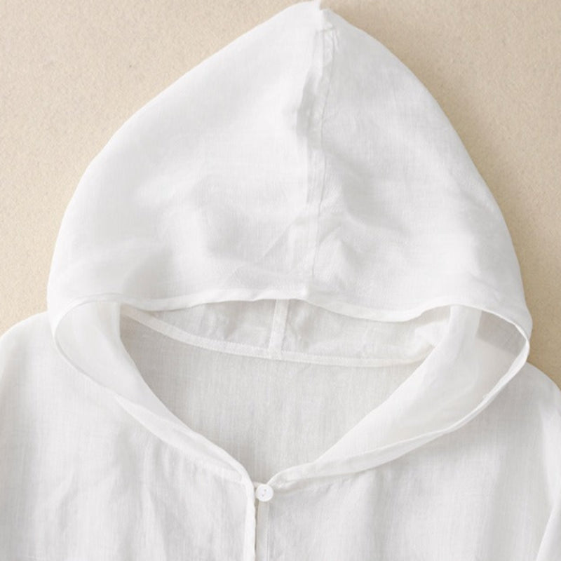 Linen, shaped to flatter. this lightweight hoodie floats with airy softness and a gathered sleeve. A gentle hood and clean buttons offer shade and ease—stitched for sun-filled walks and quiet shade.