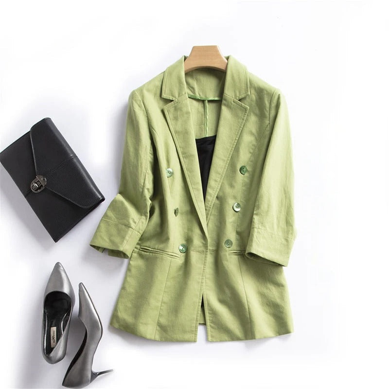 An elevated essential for warm-weather wear. Cut from our signature Gossamer Linen, this blazer unites clean structure with breathable lightness—perfect for poised moments beneath open skies.