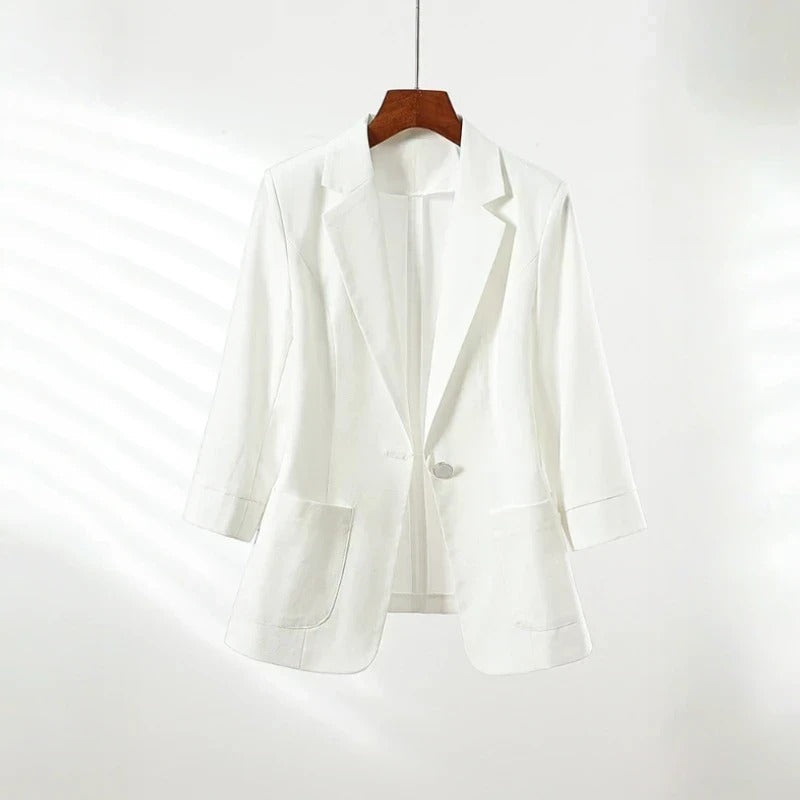 Rendered in Gossamer linen for its breathable texture and soft resilience, this blazer shapes a clean silhouette with cropped sleeves and a single-button front. Light structure meets relaxed tailoring—woven for days that move with ease.