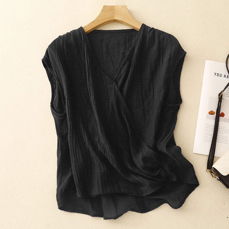 Made with our ultra-light Gossamer Linen, this sleeveless top drapes in soft folds with a wrapped front. Lightly crinkled texture and easy lines offer calm structure—stitched for sunlit hours and quiet breath.